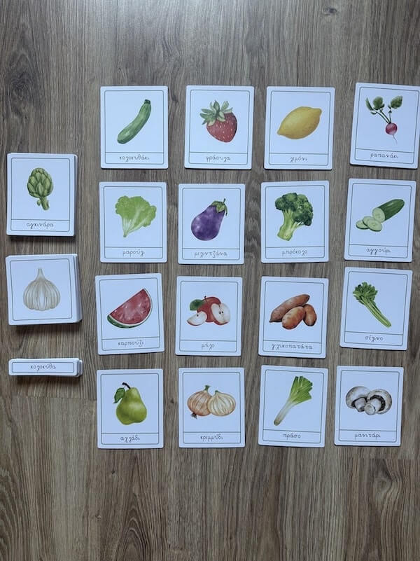 The set includes 114 cards and follows the principles of Montessori education. First, one card shows the fruit or vegetable together with its name. Then, a card shows the image only and finally, a third card displays the written word on its own. This learning activity promotes independent learning and self-correction.